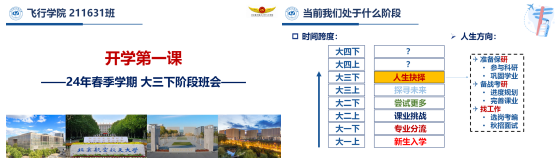 民航机务工程专业的班会从生活、作风、思想、学业规划等多个方面进行展开,针对不同年级给出相应提示和建议。并从同学们未来发展出发,针对其专业的独特性介绍可能的发展方向与相关信息获取渠道,对于考研同学进行考后心理辅导。最后开展老员工应征入伍宣传,鼓励广大同学投入到火热的强军强国建设中。