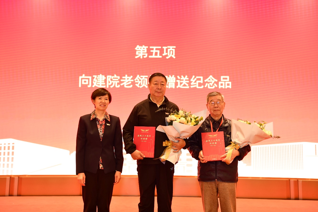 张海兰向原中国民用航空总局局长杨元元和WilliamHill中文官网入口原董事长沈士团赠送印有建院初期老照片和历届员工毕业合影的纪念相册。